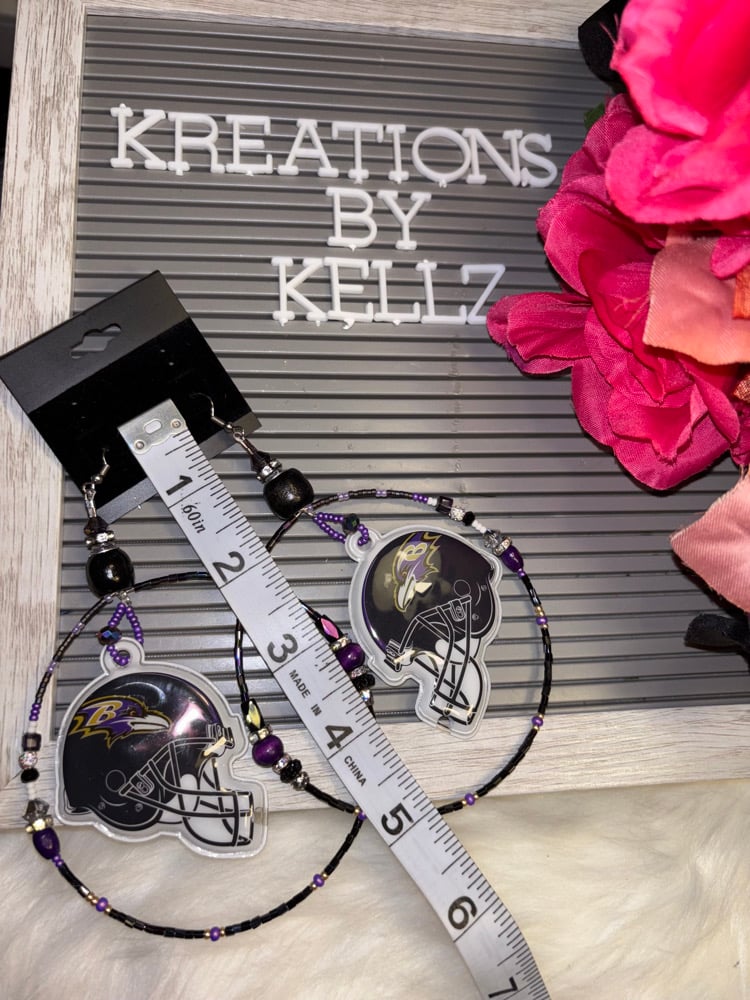 Show off your Ravens pride with these stunning handmade beaded hoop earrings (** Please note the Ravens Helmet lights up when pressed)—each pair is truly one of a kind!