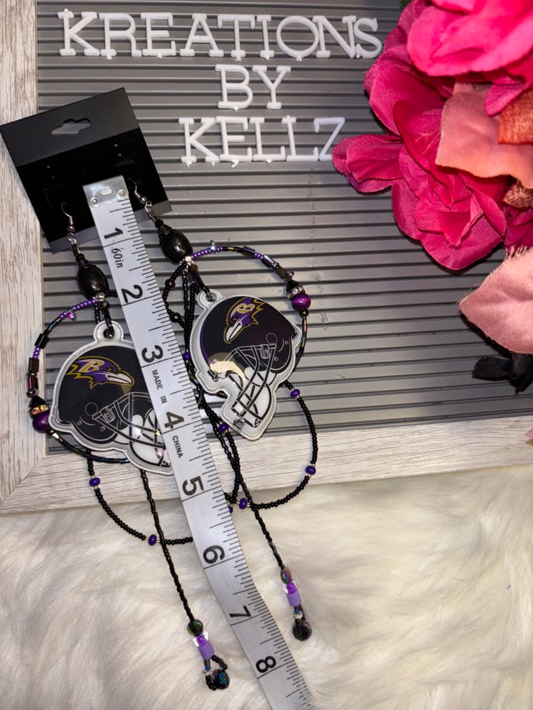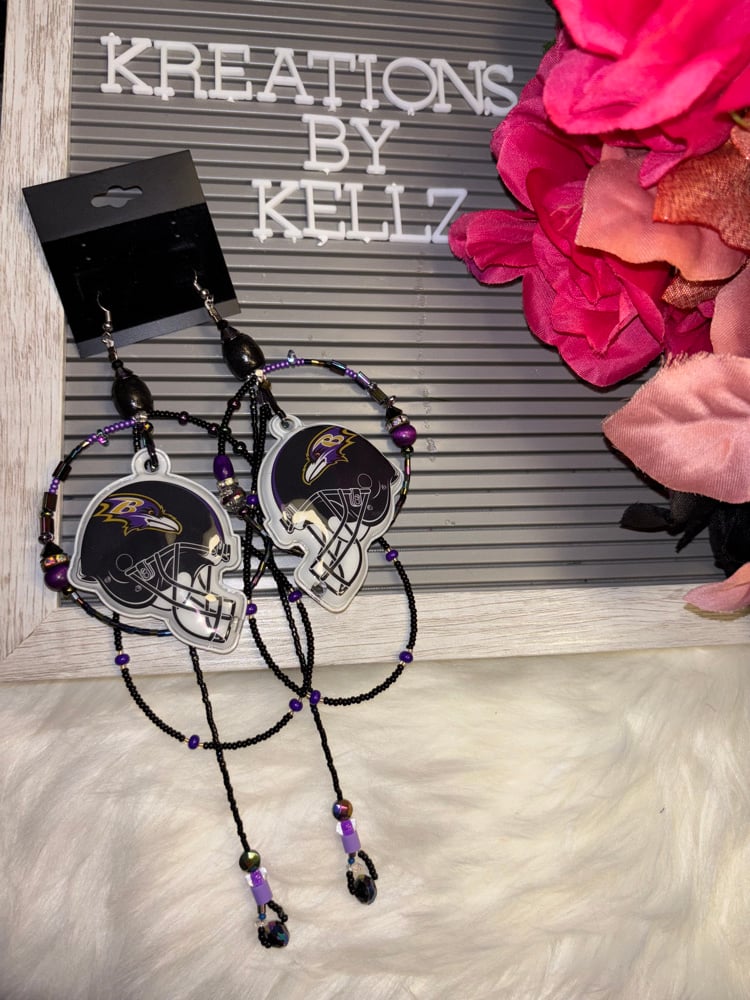 Show off your Ravens pride with these stunning handmade beaded hoop earrings (** Please note the Ravens Helmet lights up when pressed)—each pair is truly one of a kind!